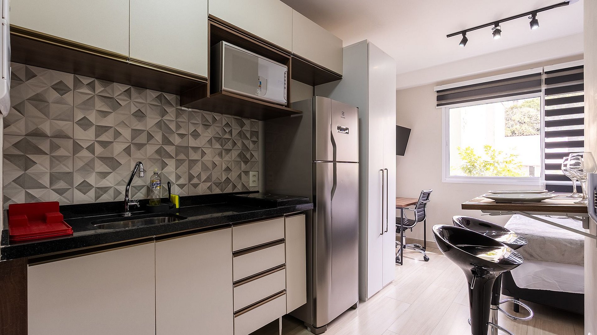 Olá, é um prazer recebê-lo(a)! O stúdio possui 18m², armários em todos os cômodos, uma deliciosa estrutura para o seu descanso ou até mesmo para quem pretende trabalhar home-office. Smart TV 50'', canais abertos, internet 250GB, cama casal com enxovais muito confortáveis, persianas blackout e A/C. Cozinha completa com geladeira, microondas, fogão elétrico, máquina de café, sanduicheira e utensílios domésticos.